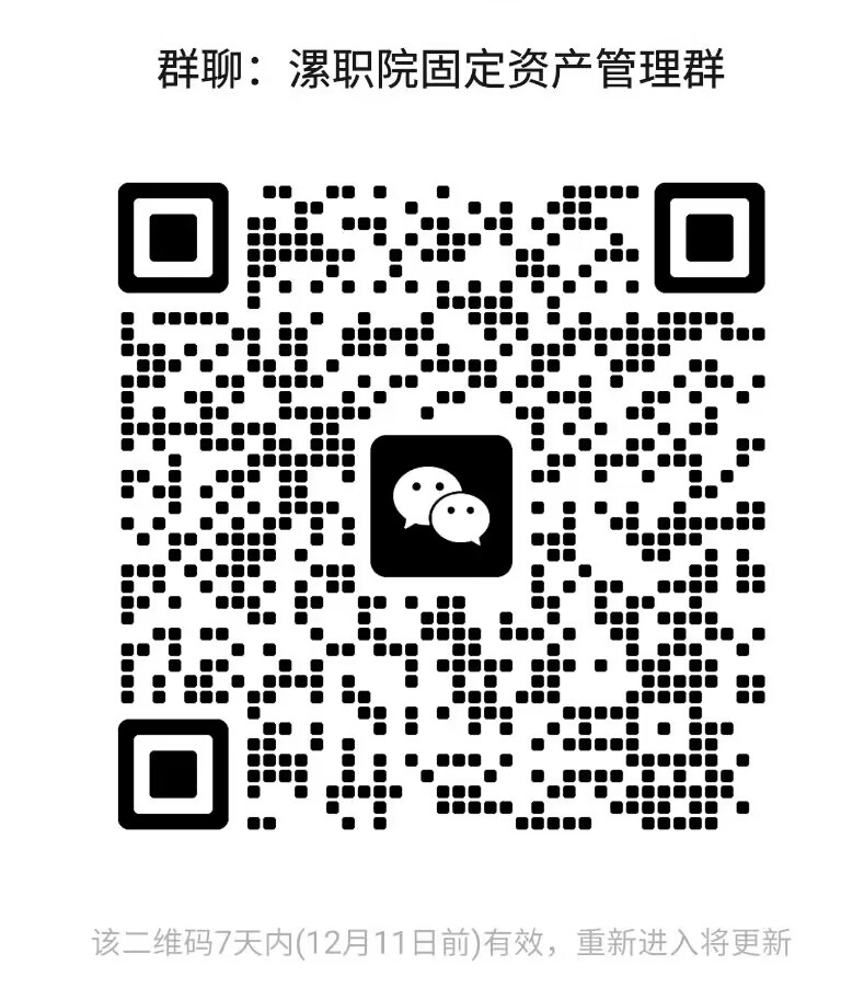 一、校属各部门请于12月15日之前报送一名部门资产管理员,加入微信群“漯职院国有资产管理群”(今后如有调整,请第一时间通知国有资产管理处)。